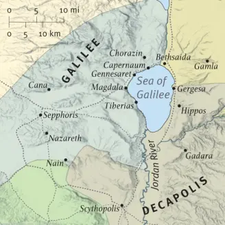 The ship had landed just south of Capernaum at sunrise. From there they walked a few miles inland to the Land of Gennesaret. This village is often mistaken as being the town of Gerasene where Jesus performed the Miracle of the Swine. Please see related: "Jesus the Demon Hunter". Gerasene has been excavated and is located directly east of Capernaum on the opposite side of the Sea of Galilee (Mark 6:33).