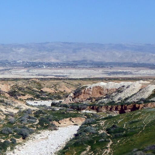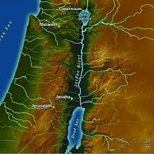 Widening our scope, the Jordan Valley runs from north to south. It starts at the Sea of Galilee and runs directly south emptying into the Dead Sea. It is 65 miles long and on average 100 feet wide. There is a major fault line that runs down the middle of the valley. This fault line is concealed by the Jordan River that flows above. The Jordan River is the boundary between Israel and the Kingdom of Jordan. The Jordan River ends at the Dead Sea the lowest land mass on the face of the Earth.