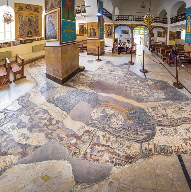 The team then continued from Mt. Nebo southeast to the town of Madaba. They wanted to visit the Church of St. George. In 1884, the church underwent a renovation. When they removed the floor stones, they discovered a detailed mosaic map of the Holy Land of the Bible. The mosaic was created in 556 AD. and is still the oldest map of the Holy Land ever found. The map clearly shows the Jordan River emptying into the Dead Sea. And, just southeast of the Dead Sea, it shows a village named Zoar and a structure known as the Place of St. Lot. The team now knew that Zoar, the only city not destroyed in the account of Sodom and Gomorrah, must be located slightly southeast of the Dead Sea as shown on the map.